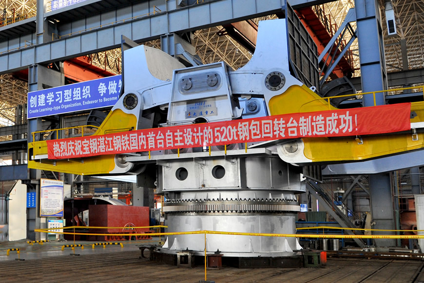 大包轉臺安裝在連鑄車間鋼水接受跨和連鑄跨之間的澆鑄平臺上,用于接受煉鋼系統送來的盛滿鋼水的鋼包,將鋼包轉至連鑄跨的澆注位置進行澆注。大連重工研制的大包轉臺產品單臂承載能力從42噸到520噸,尤其是大噸位(大于200噸)鋼包回轉臺國內市場占有率很高,產品功能從單一回轉型發展到多功能型。
